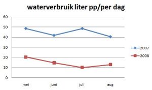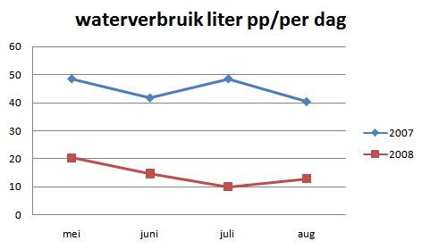 Wat water betreft is het in gebruik nemen van de watertonnen een zeer effectieve actie. In het begin gebruikte ik het regenwater enkel voor het toilet, naderhand ook voor de planten en voor het wassen van mezelf. De maand juli is wat vertekend, omdat we dan twee weken van huis waren. In elk geval is het mogelijk om met twintig liter kraantjeswater per dag te leven (de gemiddelde Belg gebruikt 120 liter). Meer besparen zou nog kunnen door de wasmachine op regenwater te laten werken. Minder drinken gaan we niet doen.