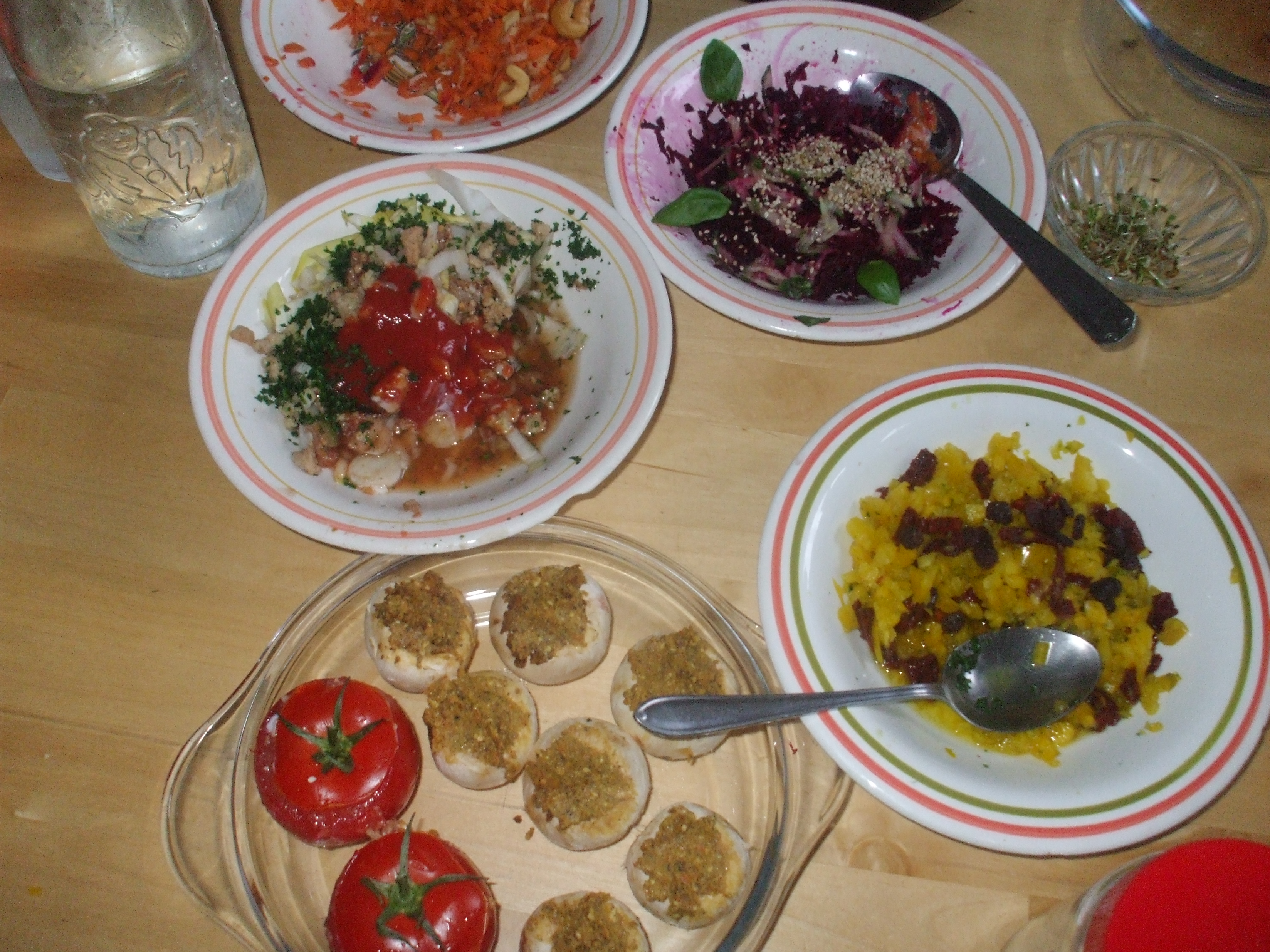Al enkele eerste conclusies na drie dagen. Een raw food regime is zeker duurder aangezien je vooral verse groenten en fruit eet. De meeste RF recepten werken met een blender (om groenten fijn te malen), ik behelp me voorlopig met de mixer van de buurman, maar dit is dus iets meer elektriciteitsverbruik. Het is niet makkelijk om RF te combineren met lokale en seizoensgebonden producten. Veel van de recepten gebruiken bananen, kokos, ananas, en andere exotische extra’s. Raw food is best wel lekker, want je smaakt veel beter wat je eet. Deze middag bijvoorbeeld wat sla, witloof, een tomaat, een stukje rode biet (uit eigen tuin), een halve paprika, beetje komkommer, luzernescheuten met wat olie, sojasaus en pompoenpitten erop gestrooid.  Bij de start had ik een RF buffet gemaakt in de hoop de kinderen een beetje te verleiden. Maar ze hebben slechts een paar dingen geproefd en hebben dan maar boterhammen met pindakaas gegeten. Gelukkig vond de cameraploeg van Canvas het wél lekker en hebben ze er flink van gegeten. Van de geroemde effecten heb ik tot hiertoe nog niks gemerkt, maar hier zal je het in elk geval als eerste kunnen lezen. Ik ben benieuwd.