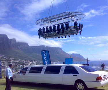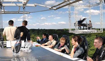 Gisteren heb ik me even laten ontvoeren door de Canvas camera ploeg. Ze hebben me meegenomen naar een bijzonder High Impact trouwfeestje. De naam zegt het zelf: ‘Marriage in the sky’. Een korte beschrijving van het gebeuren; op een verlaten startbaan in Sint-Truiden staan enkele helicopters, een uitgerekte Hummer, verschillende grote trucks en limousines en een hoop tenten. Vier gigantische kranen (80 ton) staat er met draaiende motor en aan kabels hangen diverse platformen. Eén met een eettafel, een ander met een tribune, nog eentje met een Steinway vleugelpiano en een laatste voor de pers. Zo’n vijftig meter boven de grond wordt de ceremonie afgewerkt. Op het einde van de viering springt het koppel nog even naar beneden (aan een elastiek natuurlijk). Het hele concept, bedoeld voor mensen die hun trouwpartij een exclusief tintje willen geven, kost tussen de 8 000 en de 100 000 euro.