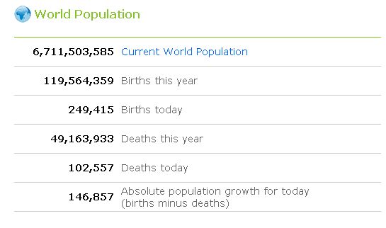 worldometers Wie het tenslotte wat groter ziet kan terecht op www.worldometers.info waar je in real time ziet hoe het zit met de bevolkingsaangroei, het energieverbruik, de militaire uitgaven of mensen met overgewicht of honger. Het is niet makkelijk te beseffen welke realiteit er allemaal achter de cijfers schuilt. Vandaag zullen er bijvoorbeeld weer ruim 150 000 mensen zijn bijgekomen. Ook zij hebben recht op hun deel van de schaarse hulpbronnen…eerlijk delen is de enige keuze zeker?