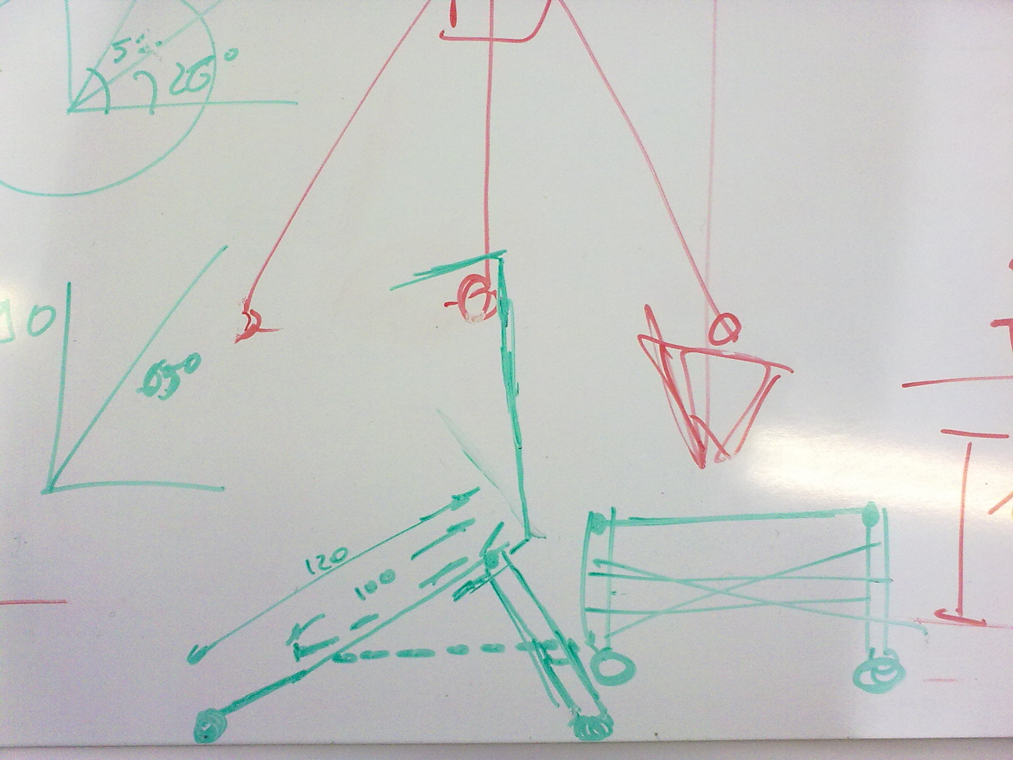 4. Na wat rekenwerk over de juiste hoeken en het brandpunt kunnen we alles assembleren. . De plaat met spiegels en de kookpot waarnaar de spiegels gericht moeten worden. Wieltjes om de hele constructies naar de zon te kunnen richten. Het prototype begint vorm te krijgen. Het plan wordt concreet.