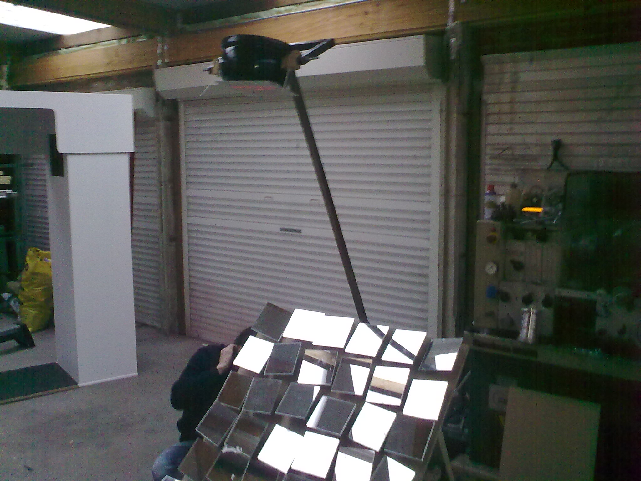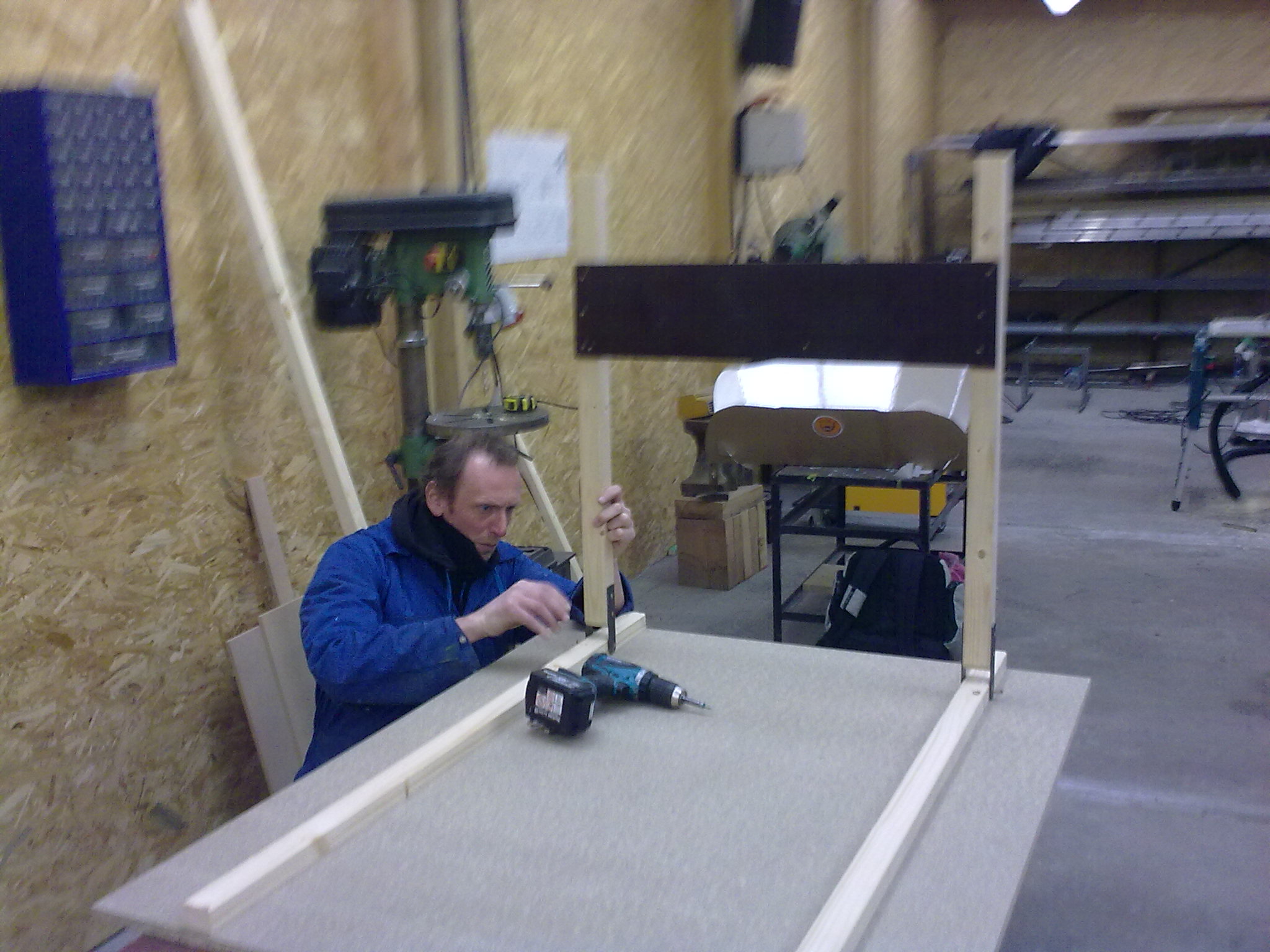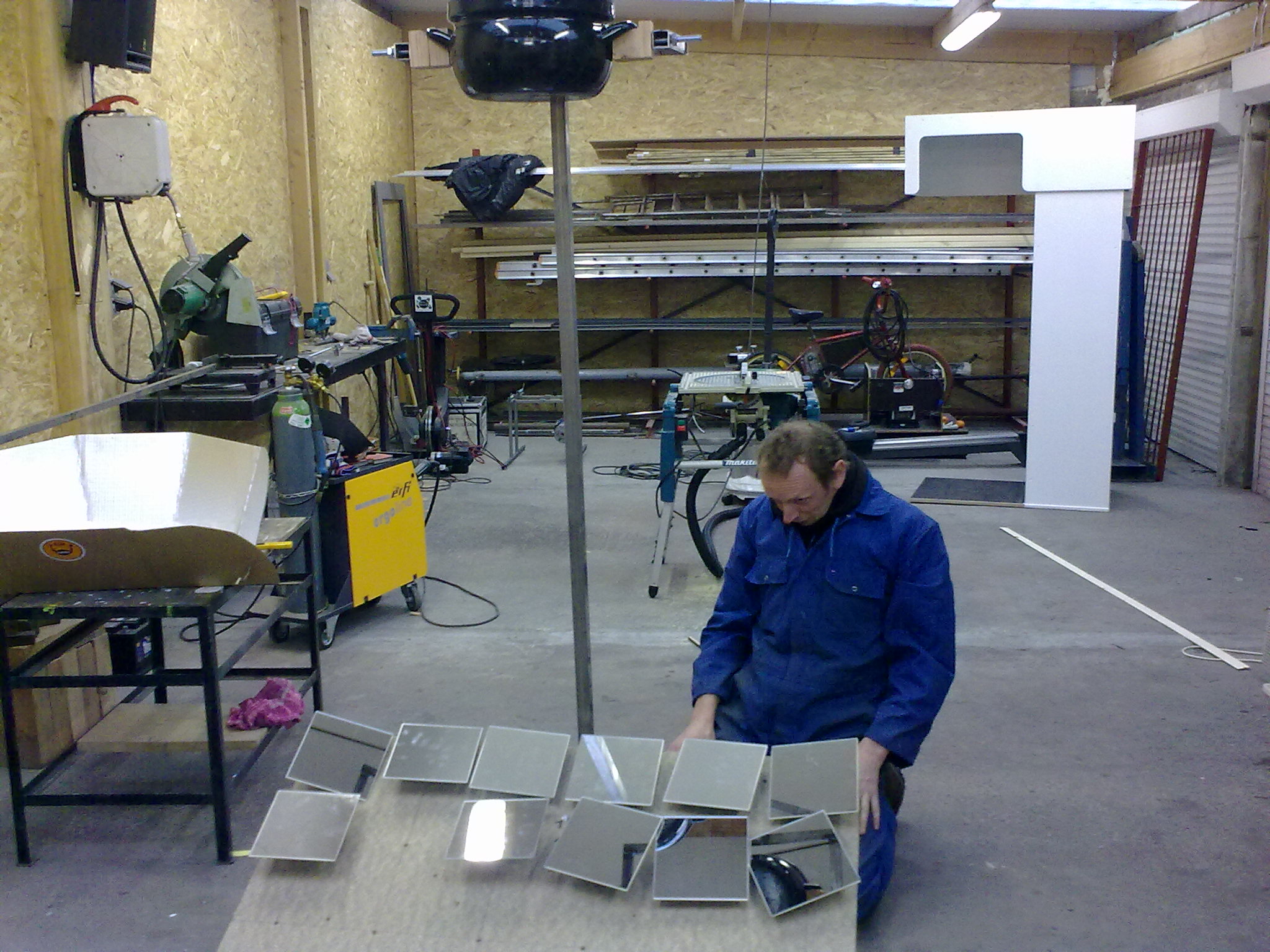 3. Voor de plaat wordt een constructie gemaakt om ze in de juiste hoek te kunnen zetten. Gelukkig weet Lieven alles van Sinussen en Co-sinussen en is Werner een crack met metaal en hout. Ondertussen krijgen de spiegeltjes allemaal een beweegbaar voetje van ijzerdraad. (daar hou ik me mee bezig)