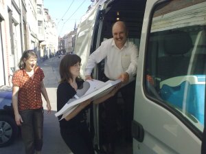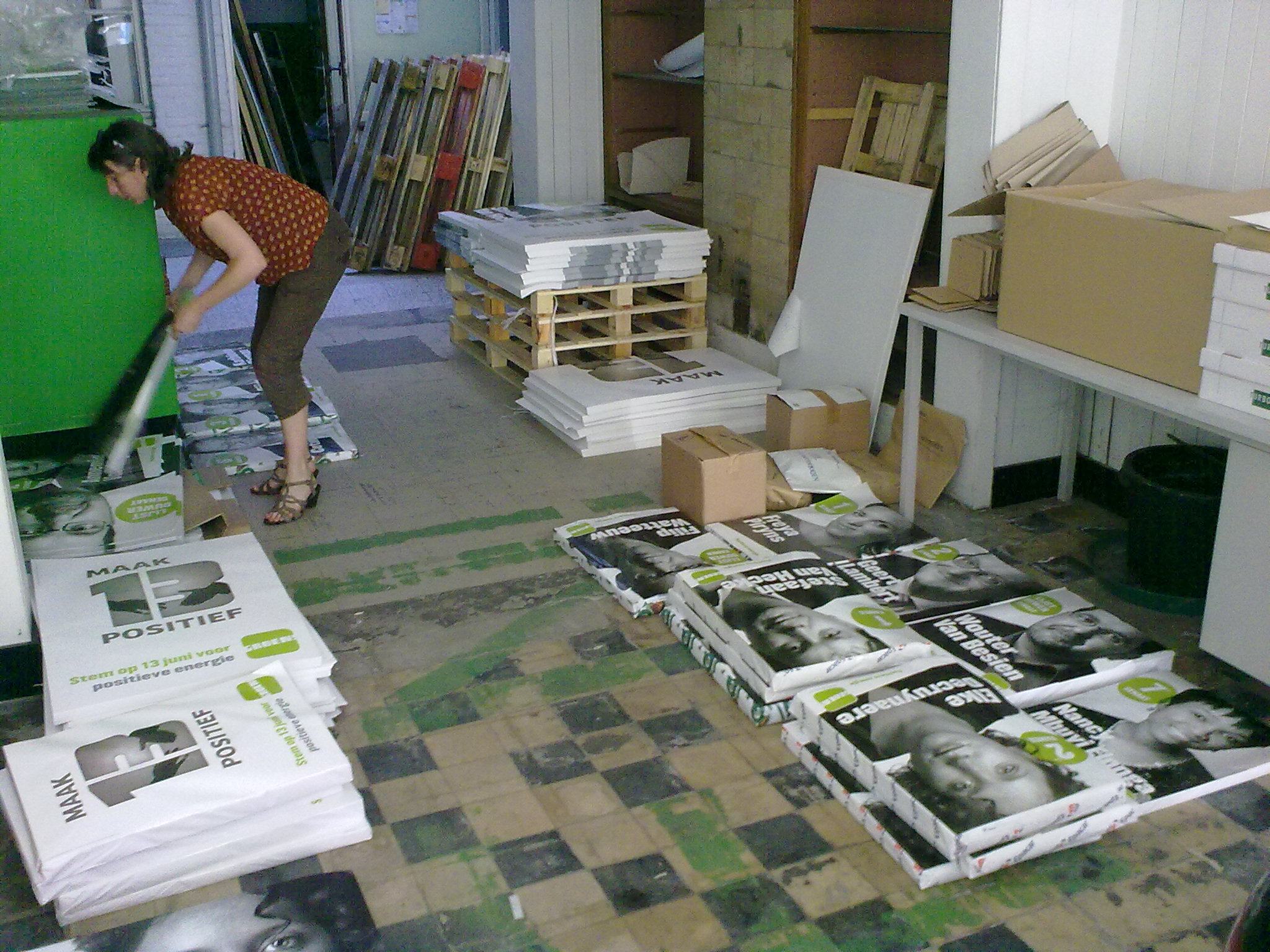 Voor wie nog steeds aan het volgen is: zo’n onderneming vraag nogal wat inzet van mensen en middelen. Gisteren werden zo’n 1000 kilogram affiches geleverd. Gedrukt in een milieuvriendelijke drukkerij met vegetale inkten op 100% gerecycleerd papier. De T-shirts zijn fair-trade en van bio-katoen, op dat soort dingen wordt wel goed gelet. En al is het bij Groen! een pak minder dan bij andere partijen, zo’n campagne heeft onvermijdelijk een behoorlijke ecologische voetafdruk. (Maar liever dat dan een dictatuur)