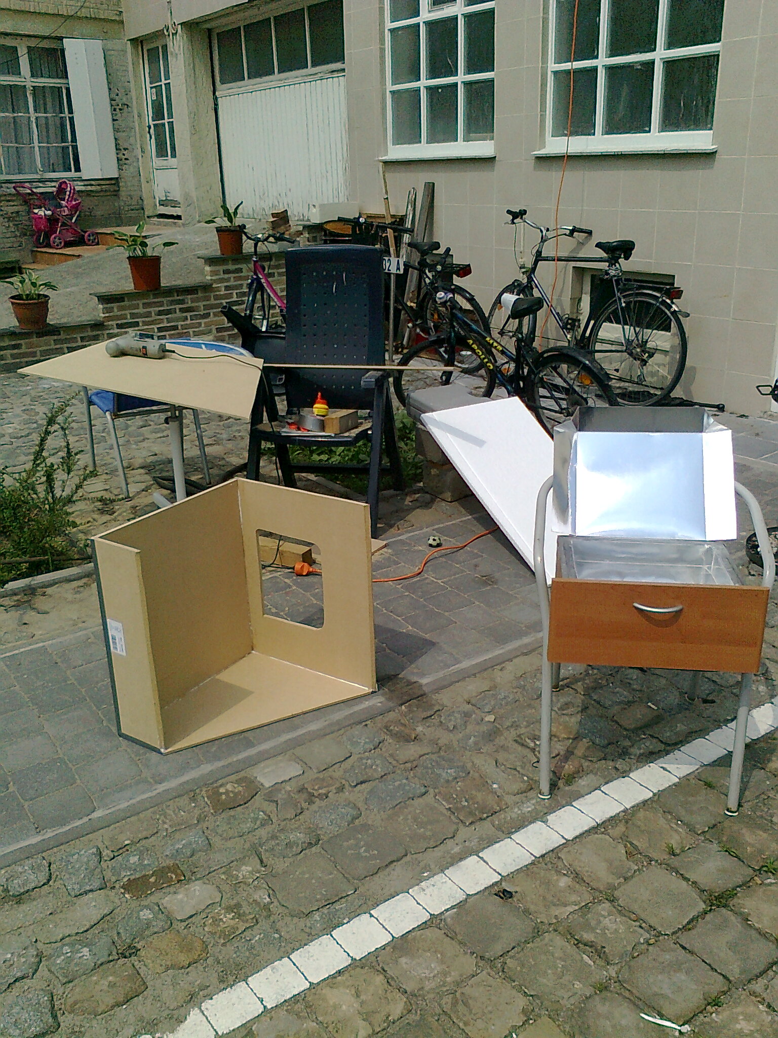 De werkzaamheden aan de zonne-ovens stonden vandaag op een laag pitje. Op de foto het frame van de grote oven die ik aan het bouwen ben en een klein proef modelletje gemaakt van een oude lade. Straks krijg ik nog bezoek van een ecologische aannemer om eens na te denken over een kleine zonnewering annex zonne-paneeltjes  voor mijn huis. Misschien lukt het op een dag om echt onafhankelijk te worden van fossiele brandstoffen!