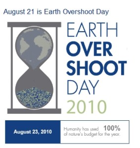 Het is een beetje als je huis verwarmen door gebruik te maken van de houten planken van de zolder. En als die op zijn, misschien de meubels, en dan de deuren en…  tja, wat doe je als je alles hebt opgebrand? Volgens de organisaties die via Earth Overshoot day aandacht vragen voor het probleem zullen we in 2010 wellicht 150% van het jaarbudget opgebruikt hebben. Dit is nog wel eens gebeurt op kleinere schaal (denk maar aan Paaseiland), maar nooit op wereldschaal.