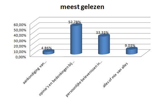 De tweede vraag gaat over de interesses. Welke stukjes worden nu het liefst gelezen. Ik moet er wel bij vermelden dat het niet mogelijk was meer dan een optie aan te vinken, en een aantal mensen gewoon hebben geantwoord met ‘alles’, ‘mix’ enzovoort. Dat er toch een duidelijke voorkeur is voor meningen over allerhande fenomenen op de tweede plaats gevolgd door persoonlijke belevenissen.