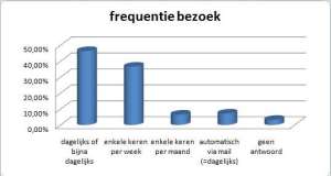 De eerste vraag ging over de frequentie van het bezoek. Zoals ik al dacht, zijn er heel wat trouwe lezers die bijna dagelijks naar de site komen (of via RSS-feed een abonnement hebben en zo elk nieuw bericht in de mailbox krijgen). Samen dus meer dan 54% van de bezoekers die zo goed als elke dag komen kijken.