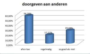 Wat me zeker ook interesseert is het mogelijke sneeuwbaleffect. Gaan de lezers van deze blog hun informatie ook delen met anderen? En kijk, bijna driekwart van de lezers zal informatie soms of zelfs regelmatig doorgeven aan andere mensen. Dat lees ik graag natuurlijk.