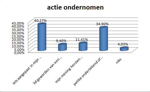 Dan was er nog de vraag of het lezen van deze blog ook aanzet tot specifieke acties. Ook hier konden mensen maar één optie aanvinken). Toch wel een positief resultaat, op 4% na hebben alle lezers naar aanleiding van de blog wel iets gedaan. De eigen mening aangepast (11%), lid geworden van een groep (9%) een petitie ondersteund (35%) of iets aangepast in het eigen leven (40%)
