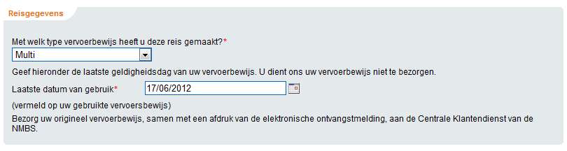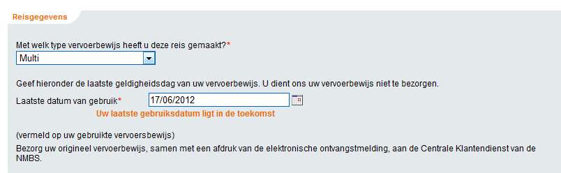 Na het invoeren van persoongegevens moet je reisinformatie doorgeven. Welk ticket had je? Je kan kiezen uit biljet, combi of treinkaart. Ik heb een railpass, dus ik vermoed dat dit een combi is. Dan lees je volgend bericht: