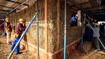 Ik voel mijn rug niet meer, maar het is gelukt. Mijn strohuisje is bijna klaar. De voorbije maanden heeft Adam samen met een aantal van zijn collega’s het houten skelet van het huis op een stevige fundering gezet. Een moeilijkheid was om het skelet stevig genoeg te maken voor de daktuin. Daarvoor waren een aantal extra balken nodig. De voorbije weken hebben we dan met een ploeg van een tiental mensen de strobalen muren gebouwd en geleemd. De deuren en ramen konden we recupereren bij de afbraak van de nutteloos geworden Media Markt in Oostakker.