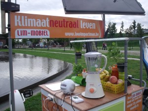 Kortom de Lim-mobiel bevat een aantal van de mogelijke high-tech en low-tech oplossingen die we nodig hebben als we het zonder fossiele brandstoffen willen. Enkele panelen op de fiets geven de nodige uitleg, en via een rekje met folders over de verschillende toepassingen kunnen de bezoekers zich verder informeren.  De LIM-mobiel is in de eerste plaats bedoelt voor educatieve activiteiten, maar stilletjes droom ik ervan om er ook mee op reis te gaan. Dan zal ik nog een aanhangwagentje nodig hebben voor de tent en een composttoilet  en heb ik alle mogelijke toepassingen van een mobielhome, maar dan zonder fossiele brandstoffen.