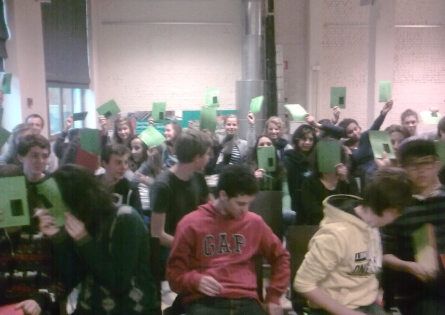Nogmaals groeten van uw nederige dienaar voor één dag. Op de foto ziet u de tweede lading zielen die we vandaag met waarheid verlicht hebben. Dit was de tweede lezing (mijn belangrijkheid ter plekke groeit zienderogen) en langzamerhand dringt de vernietigende boodschap door: 1 We zijn gejost en nog geen beetje. 2 Low Impact propageren is zwaar werk, echt waar. Ik zal jullie allemaal nog een slottoespraak proberen geven, na de theatervoorstelling van vanavond; daarna nemen we afscheid. Ik mis het nu al.