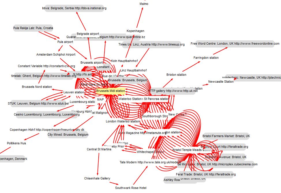 meegeven met reizigers die de trip toch maken. Ze brengt ook helemaal in kaart welke weg een product aflegt, en ook de kostenstructuur is in detail terug te vinden. Tenslotte krijg je ook verhalen van de reis van het product. Omdat alle tussen stapjes in een database worden bijgehouden worden de trajecten en netwerken ook zichtbaar. Het kaartje hiernaast toont bijvoorbeeld alle transacties die langs Brussel Zuid zijn gelopen. Kate kan niet leven van deze handel, en heeft ook geen ambitie om dit op grote schaal te doen, maar het is een boeiend maatschappelijk onderzoek en kunstproject.