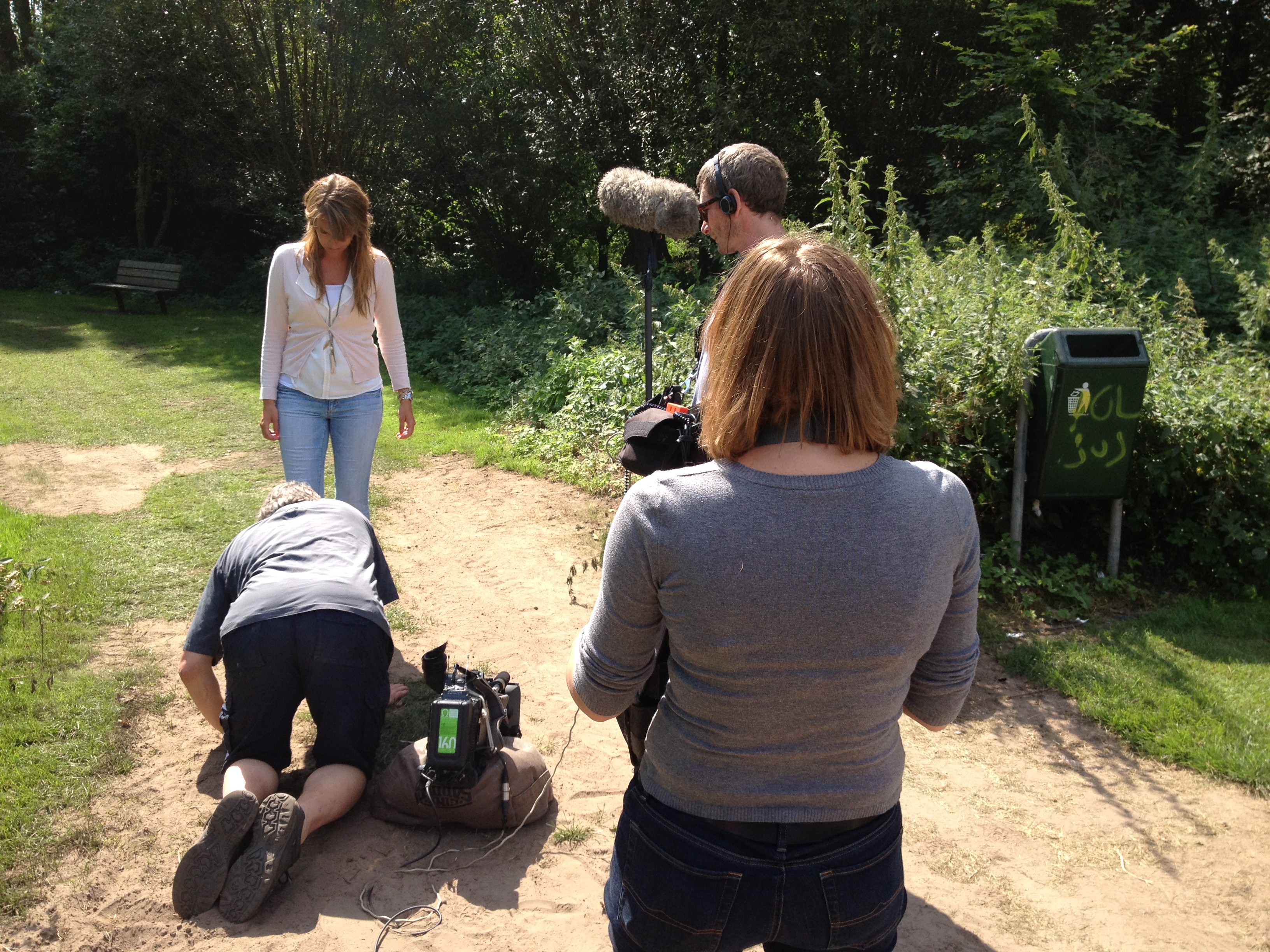 De beschrijving: cameraman probeert de voetafdruk van de presentatrice in beeld te brengen. Regisseur en geluidsman kijken gespannen toe. Door het stof kruipen voor een mooi beeldje, dat is het lot van de cameraman.