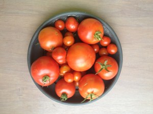 Hiernaast zie je de tomatenoogst van deze morgen. De voorbije weken kan ik om de 2 dagen zo’n assortiment tomaten plukken, en dat allemaal van 1 parkeerplaats. De courgettes hebben ondertussen hun beste tijd gehad, van de boontjes hebben we 2 keer kunnen eten, wat er nu nog komt zijn wortelen en pompoenen. En tomaten natuurlijk. Omdat dit er wat te veel zijn om allemaal zelf op te eten kunnen nu ook buren ervan genieten.