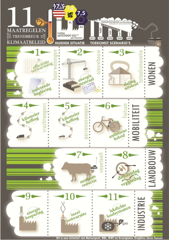 De milieubeweging levert niet alleen kritiek, maar ook 11 klimaatmaatregelen die cruciaal zijn om de negatieve emissietrend om te buigen. Als we die nu al eens op gemeentelijk en stedelijk niveau omzetten in concrete acties, dan zijn we al een stapje verder.