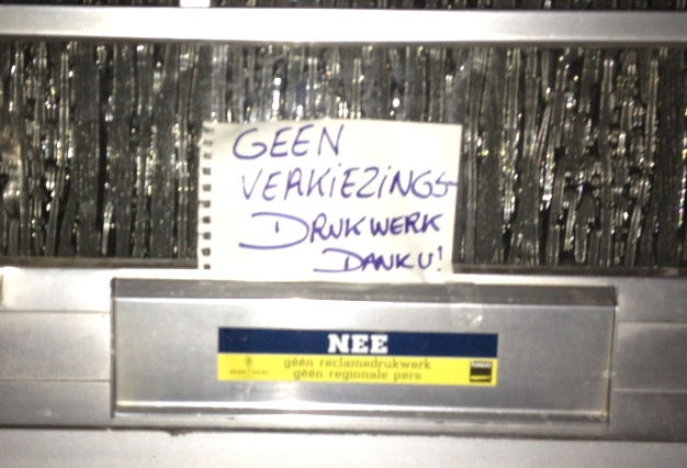 Wat blijft er dan over ? Zelf een sticker maken met de melding : geen verkiezingsdrukwerk AUB,