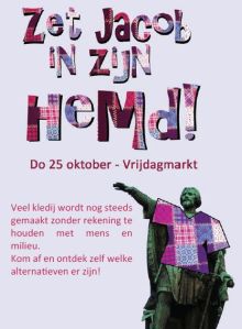 De textielindustrie werkt erg vervuilend en gaat gepaard met slechte arbeidsomstandigheden. Deze actie wil aantonen dat je als consument een keuze kunt maken voor duurzame kledij. Rondom Jacobs standbeeld op de Vrijdagsmarkt kan je leuke winkeladresjes vinden voor eerlijke kledij. Passanten kunnen zelf creatief aan de slag om uit restjes stof een tas te maken of een T-shirt te pimpen. LinX+ vertelt in een duurzaamheidssalon over de beginselen van ecokledij. O’zon toont duurzame kledij uit hennep en bamboe.