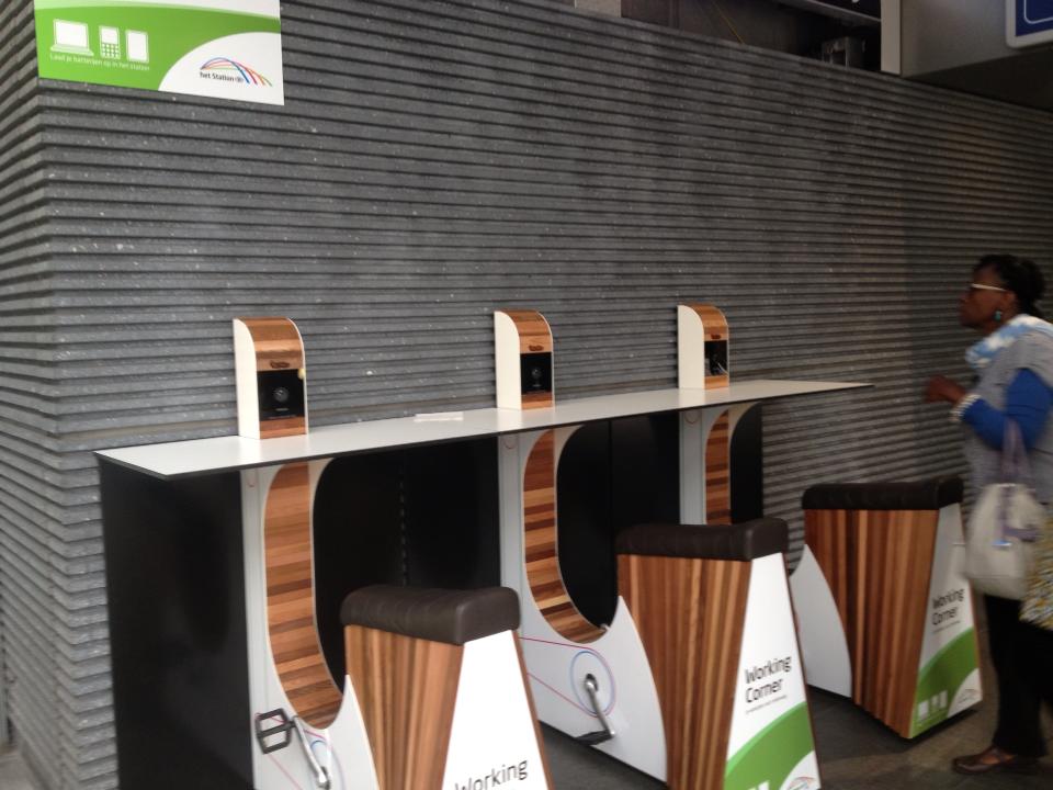 Drie exemplaren van de ‘human powered’ workstations waar mensen hun laptop of telefoon kunnen opladen en er meteen WIFI bij krijgen. Niet dat dit nu het energieprobleem zal oplossen, maar leuk om zien hoe een experimentje van een zogenaamde groene jongen inspiratie kan leveren voor een heus bedrijf.