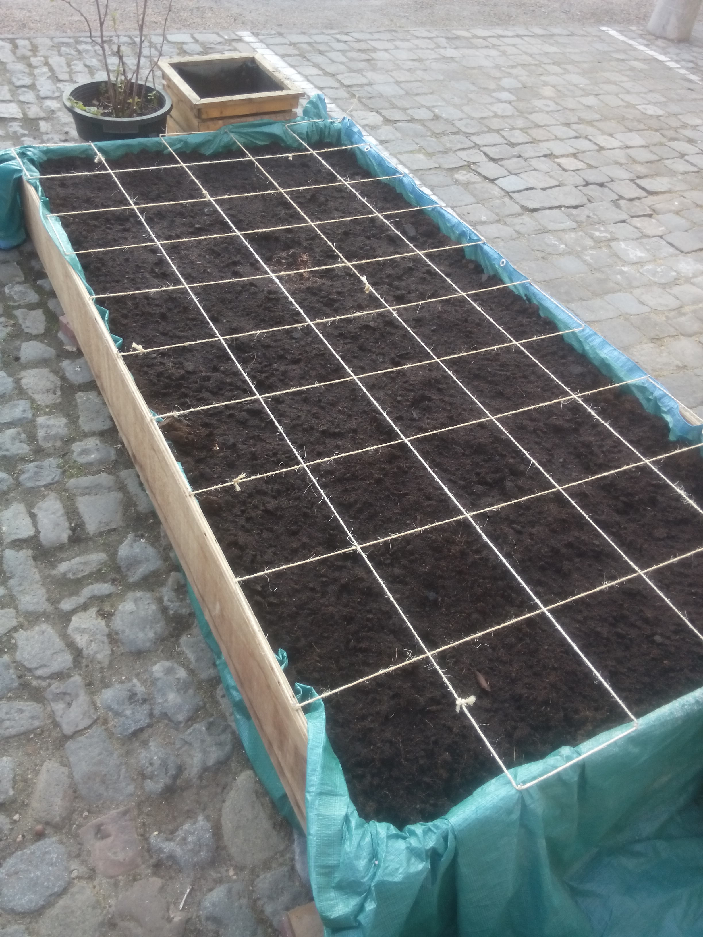 Natuurlijk heeft het goede weer van de voorbij week me ertoe aangezet opnieuw de parkeermoestuin op te starten. Nadat ik de voorbije twee jaar vooral in potten heb geëxperimenteerd doe ik het nu anders. Ik ben begonnen met een houten bak van 2,5 op 1,25 meter met daarin een zeil (met enkele gaatjes om overtollig water te laten wegvloeien).