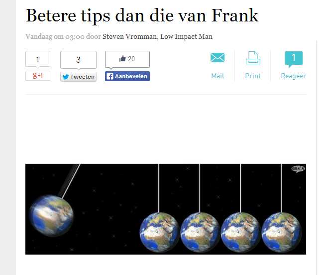 U hebt ze ook wel gezien of gelezen, de tips van Frank om het klimaat te redden. Ik heb er toch een paar bedenkingen bij en deze zijn vandaag te lezen in De Standaard.