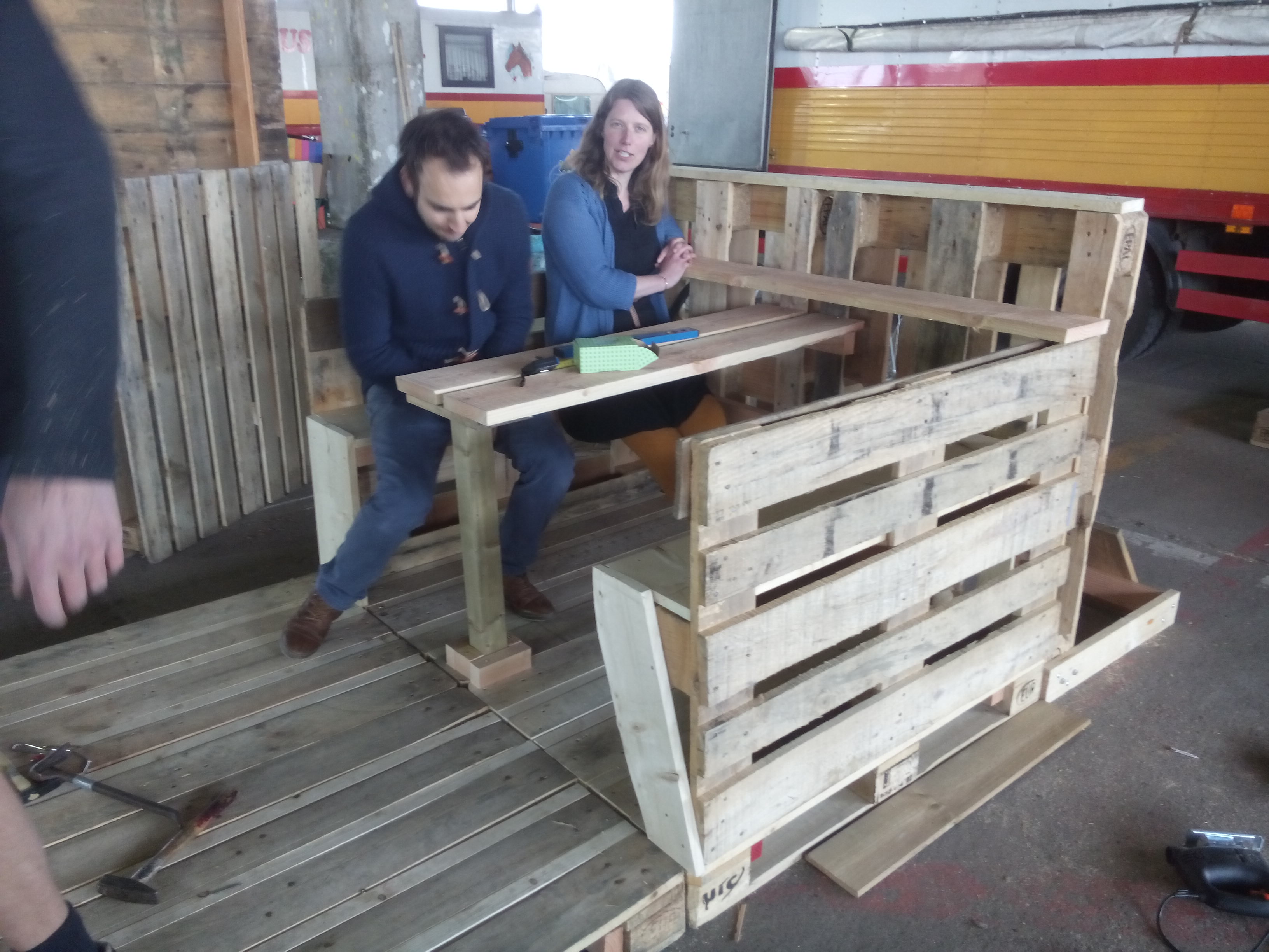 Iets later dan ben ik op DOK, waar de resultaten getoond worden van een namiddag werken aan ‘parklets’, de constructies die de volgende maanden terecht zullen komen in 10 verschillende leefstraten. Een ploeg mensen is er enthousiast aan het timmeren geslagen, en opnieuw ben ik verrast door de creativiteit waarmee mensen hun eigen stad vorm geven. Je kan als