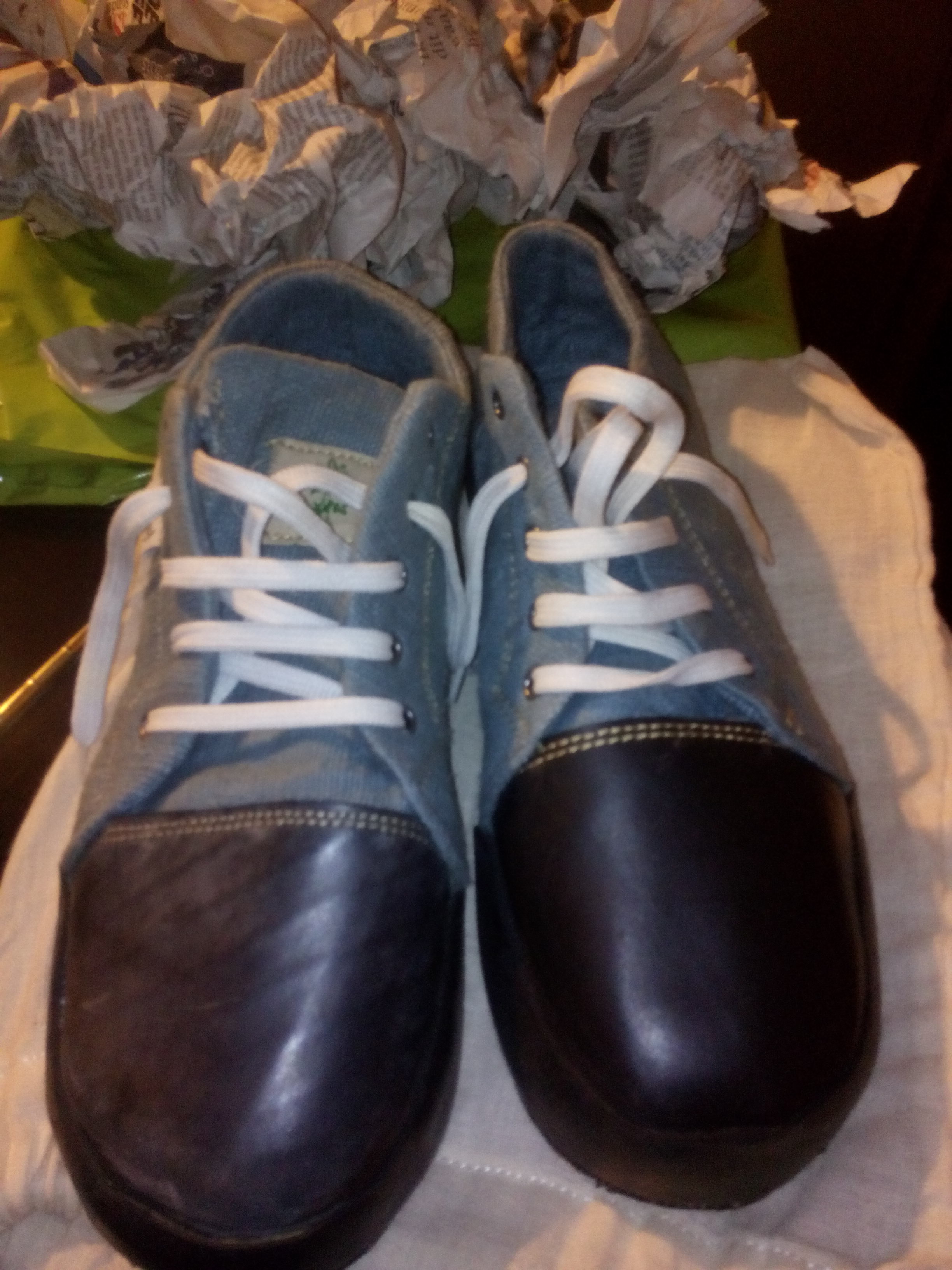 Ze zitten goed (alleen de veters zijn wat aan de korte kant) en zondag kan ik ze meteen showen op de boekvoorstelling, want, wie het schoentje past trekke het aan.