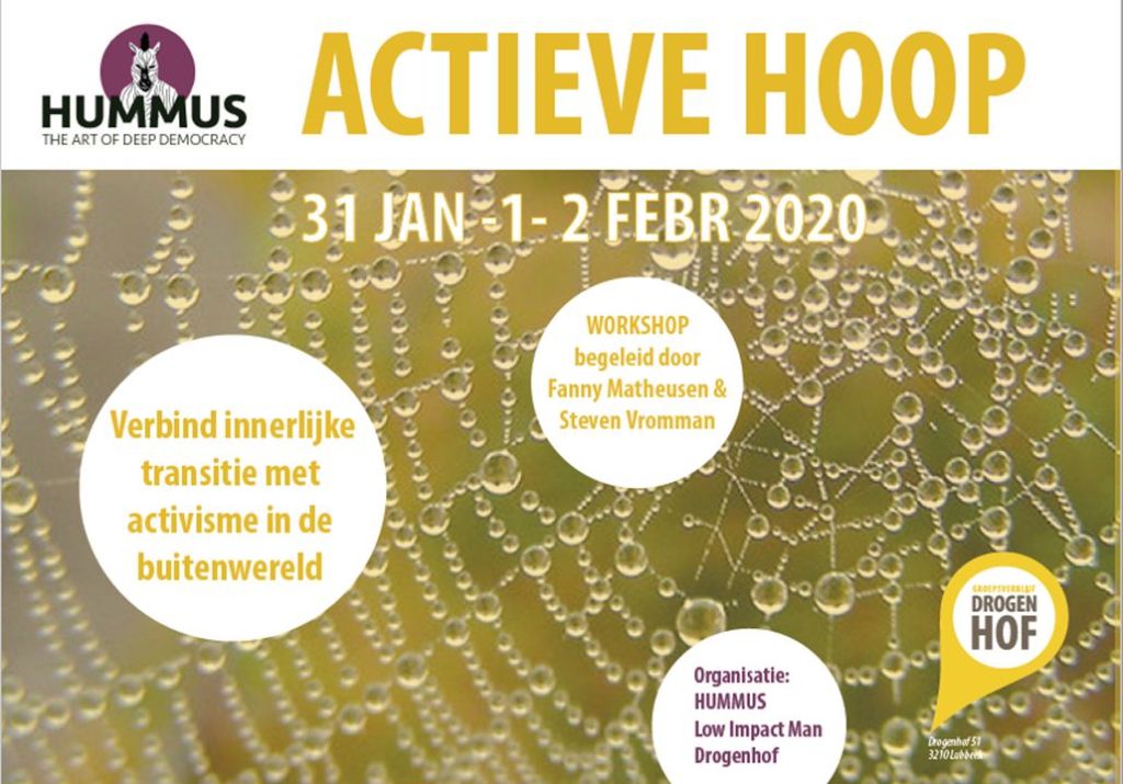 | Samen met Fanny Mattheusen (Hummus) gaan we een weekend mee in het gedachtegoed en de oefeningen van Joanna Macy. Beseffend dat we leven in de tijd van ‘De Grote Ommekeer’, is zij op zoek gegaan naar de diepere lagen van bewustzijn die ons kunnen helpen de juiste dingen te doen in het leven. Zij verbindt innerlijke transitie met activisme in de buitenwereld, binnenmotor met buitenkracht. Een weekend voor al wie haar verbondenheid met het levensweb wil verbreden of verdiepen. De 3-daagse gaat door in Drogenhof, een bijzondere plek gericht op ontmoeting en verstilling. Voor wie? Iedereen die nieuwe manieren zoekt om in deze tijd van verwarring en verandering staande te blijven. Mensen die actief zijn in de klimaatbeweging, die zelf met groepen werken of innerlijke processen willen koppelen aan een actief engagement voor een rechtvaardige en duurzame wereld. Praktisch: van vrijdag 31 januari om 18 uur tot zondag 2 februari 2020 om 16 uur. Plaats: Groepsverblijf Drogenhof, Drogenhof 51, 3210 Lubbeek Inschrijven via dit formulier Basisprijs: 300 euro (excl BTW) voor begeleiding, slapen en maaltijden Je ontvangt ook gratis het boek Actieve Hoop van Joanna Macy. Meer info |