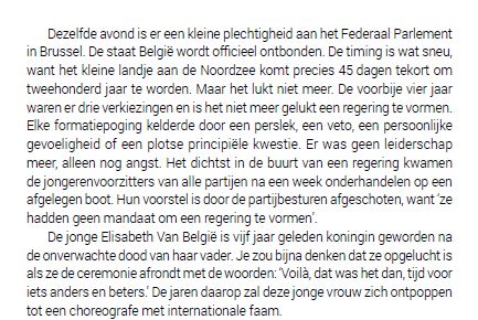 Het is precies een week geleden dat de crowdfunding voor het boek is gelanceerd. Bijna een derde van het doel is bereikt, dus dank aan iedereen die al heeft gesteund. De sympathieke eerste burger van het land (Stephanie D’Hose) heeft ook twee exemplaren besteld. Misschien kan ze wat ideeën over politieke vernieuwing uit het boek toepassen. Het is wel zo dat in mijn toekomstverhaal een einde komt aan België. Een fragment uit 2030.