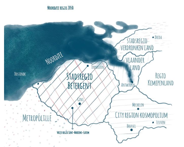 En dus ziet de regio aan de Noordzee en toch wel helemaal anders uit dan vandaag. Over het speciaal statuut van Sint-Martens-Latem en de lotgevallen van Vlaanderland ga ik niet uitweiden. Wat er met Middelkerke gebeurde zullen lezers van de blogversie van het boek misschien nog weten. Het kaartje hierboven is van de hand van Inge Deketelaere, die nog enkele illustraties maakte die het boek zullen sieren.