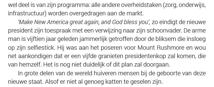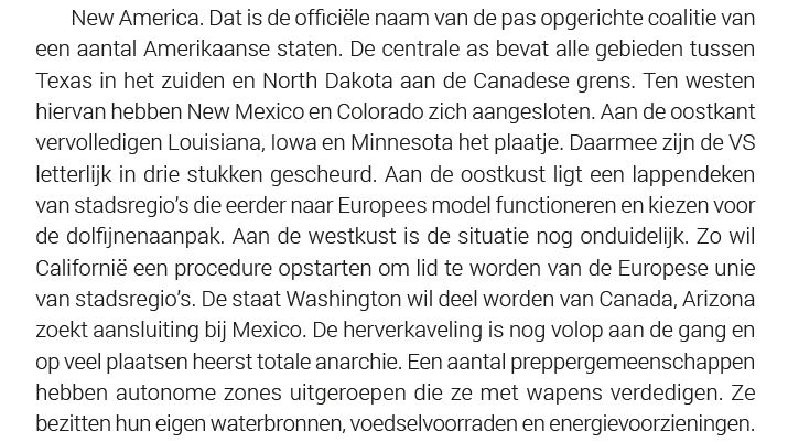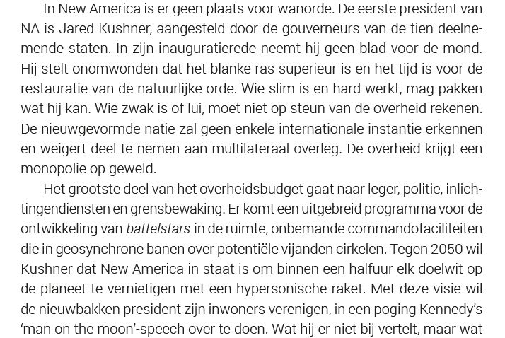Het was me wat woensdagnacht, de bestorming van het Capitool. Opvallend is dat zowat alle experten het over één ding eens waren; ‘dit hadden we niet zien aankomen.’ Dat is nu typisch voor de toekomst, het is moeilijk om onverwachte zaken te zien aankomen. Voorspellingen maken is altijd riskant, nadenken over mogelijke scenario’s kan wel natuurlijk. In ‘Amor Mundi’ staat het einde van de VS ook op het programma. Het gaat als volgt (4 oktober 2041):