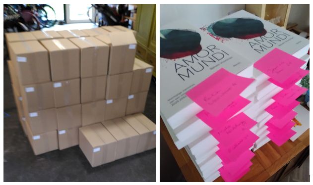 Gisteren is een pakje bij me afgeleverd; 420 kilogram boeken. Altijd een bijzonder moment om het boek voor de eerste keer vast te kunnen pakken. Ik ben meteen begonnen met het bezorgen van een aantal bestellingen op wandel- en fietsafstand. Daarnaast ben ik tientallen pakjes aan het maken en zullen alle mensen die via de crowdfunding een boek besteld hebben binnenkort hun exemplaar thuis ontvangen. Ook het bevoorraden van boekhandels kan nu beginnen.
