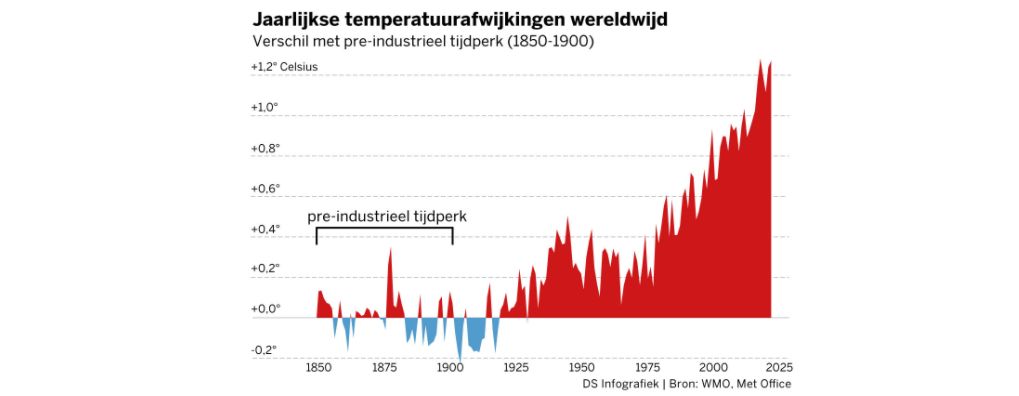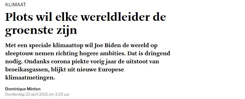 De grote woorden van politici zijn natuurlijk niet voldoende om het tij te keren. Want ondanks een economisch rampjaar door Corona blijven de CO2 concentraties én de temperatuur stijgen. Dit kan je zien op de ppm-klok van de Voo?uit én op deze teller. Van een vertraging van de uitstoot is nog geen sprake, van een piek nog minder. Daarom denk ik dat de in Parijs vooropgestelde 1,5 graden niet meer haalbaar is. We zitten nu al 1,2.