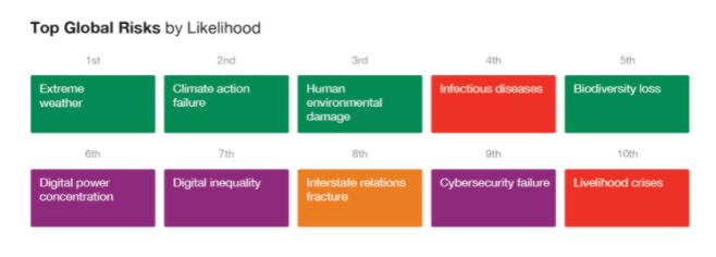 De toekomst voorspellen is niet mogelijk. Wat wel kan, is in kaart brengen wat mogelijke risico’s zijn. Verschillende bedrijven en overheden zijn hiermee bezig. Er bestaat zelfs een heus vakgebied rond: Integrated Research on Disaster Risk (IRDR). Ook denktanks en gespecialiseerde bureau’s houden zich bezig met inschatten van risico’s. Als we kijken welke dit zijn op wereldvlak is het jaarlijkse Global Risk Report van het Wereld Economisch Forum een aanrader. Hieronder de top tien van de grootste risico’s op dit moment.