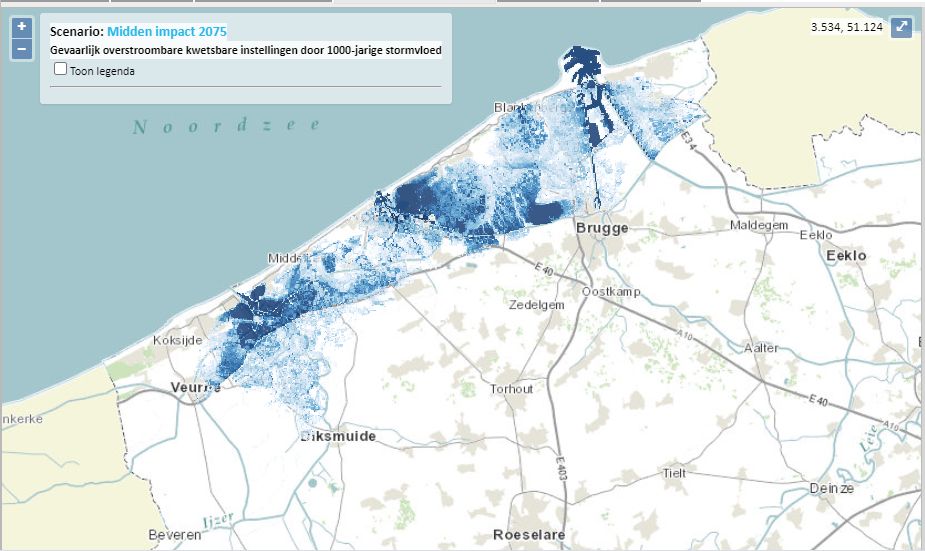 Wateroverlast. Er zijn verschillende manieren om op te zoeken hoe hoog je woning ligt. Voor mijn huis kom ik op 12 meter (topogratische kaart), op 11,3 meter via Geopunt. Voor een stijgende zeespiegel is er geen acuut gevaar hier, maar regenbommen kunnen wel schadelijk zijn. Bij het bestuderen van de hoogtelijnen rondom ons is duidelijk dat water via onze straat richting het lagergelegen gebied aan de Schelde kan stromen. Dus een volle kelder en een tijdelijke rivier in onze straat is wel mogelijk. Wie dichter bij de kust woont doet er goed aan deze kaarten eens te bestuderen. Een apartement kopen aan de kust lijkt misschien een goede investering, maar binnen dertig jaar krijg je het ding niet meer verkocht. Op waterinfo kan je steeds actuele info vinden over grondwaterstanden, risico op overstromingen en waterkwaliteit. Kijk zeker eens na of je in de buurt van een rivier woont.