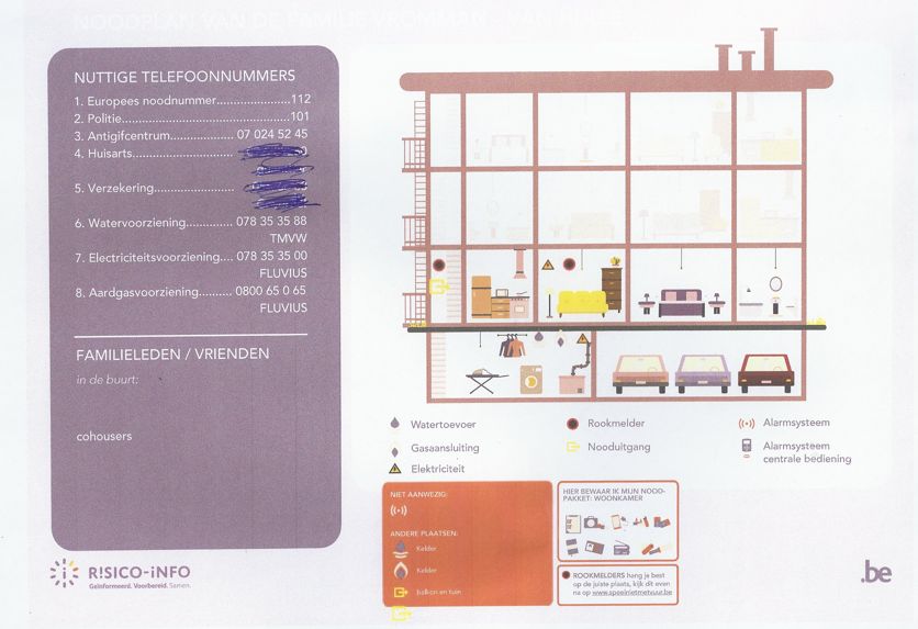 Ik heb de zeven stappen doorlopen, maar het resultaat is toch een beetje mager. Je moet een aantal telefoonnummers invoeren (dokter, verzekering) en aangeven op een plannetje waar je noodspullen zich in huis bevinden, en hoe je het huis kan verlaten. Dan krijg je een pdf van vier bladzijden, met daarop in principe alle informatie gebundeld. Het feit dat er drie auto’s in de kelder staat zegt al genoeg over de vooringenomenheid van de ontwerpers. Wij hebben geen auto!!