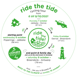 En binnen 10 dagen zijn we hopelijk weer met vele in Brussel voor de klimaatbetoging. In de aanloop daarvan start volgende week de Ride the Tide, een fietstocht langs de zone’s die de komende decennia bedreigd worden door overstromingen. Je kan hieronder alle details vinden en zelf een stukje meefietsen!