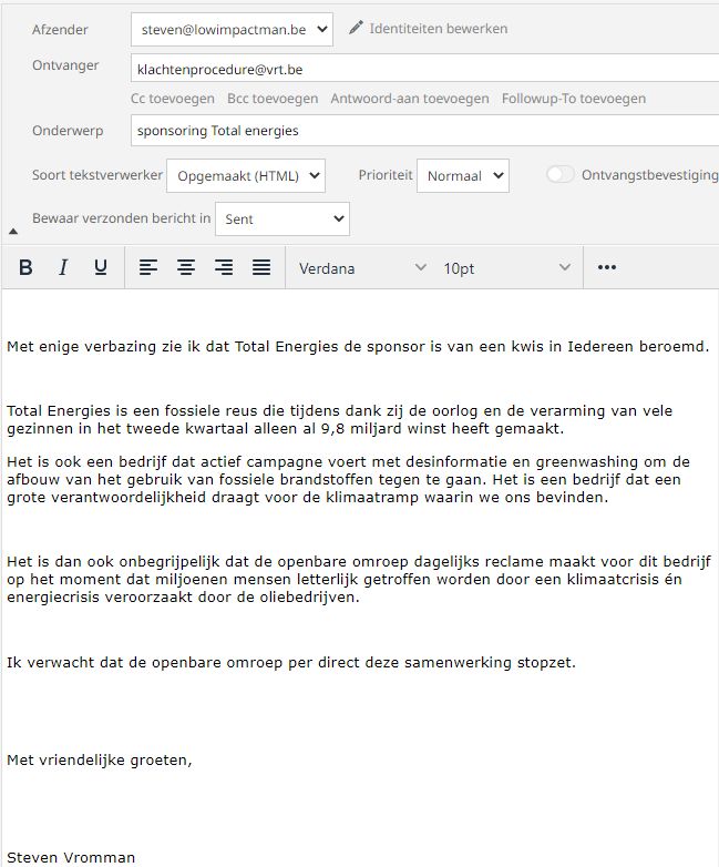 tegen greenwashing op de openbare omroep. Graag een ontvangstbevestiging en
