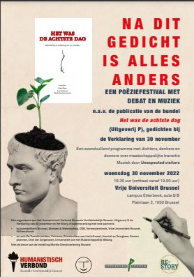 Op 30 november kan je terecht in Brussel voor een bijzonder evenement. Een poëtisch festival ‘ Na gedicht is alles anders’, naar aanleiding van de uitgave van de dichtbundel ‘ Het was de achtste dag’.  52 Nederlandstalige dichters schreven een gedicht bij de Verklaring van 30 november. Dichters voelen de tijdsgeest als geen ander aan en zijn als geen ander in staat om onze verlangens te verbeelden. Inschrijven doe je hier.