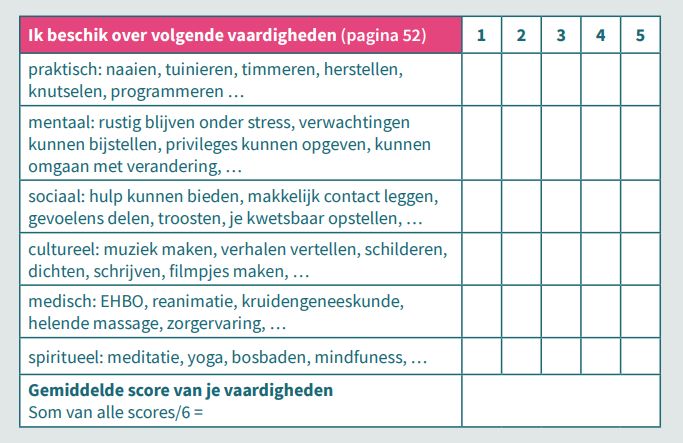 Via een aantal vragen breng je in kaart hoe het zit met wonen, gezondheid, netwerk, vaardigheden, spullen, financiën en veerkracht. Het is natuurlijk geen wetenschappelijk instrument maar ik heb het al bij verschillende mensen getest en dan blijkt dat het toch wel inzicht kan bieden (en soms wat confronterend is). Centraal kan je de scores invullen en de punten verbinden en de vorm inkleuren. Hoe groter het gekleurde vlak hoe meer je klaar bent voor turbulente tijden. Omdat het beeld hierboven wellicht onleesbaar is, een fragmentje. De vragen over toekomstvaardigheden.