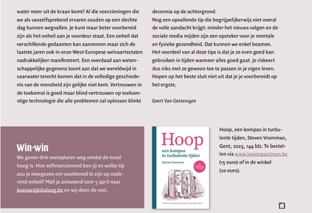 Ik kreeg net het nieuwe nummer van de Koevoet in de mailbox. De Koevoet is een interessant tijdschrift dat al vele jaren over heel wat ecologische thema’s schrijft. In dit nummer ook een bespreking van mijn boek én een interview.