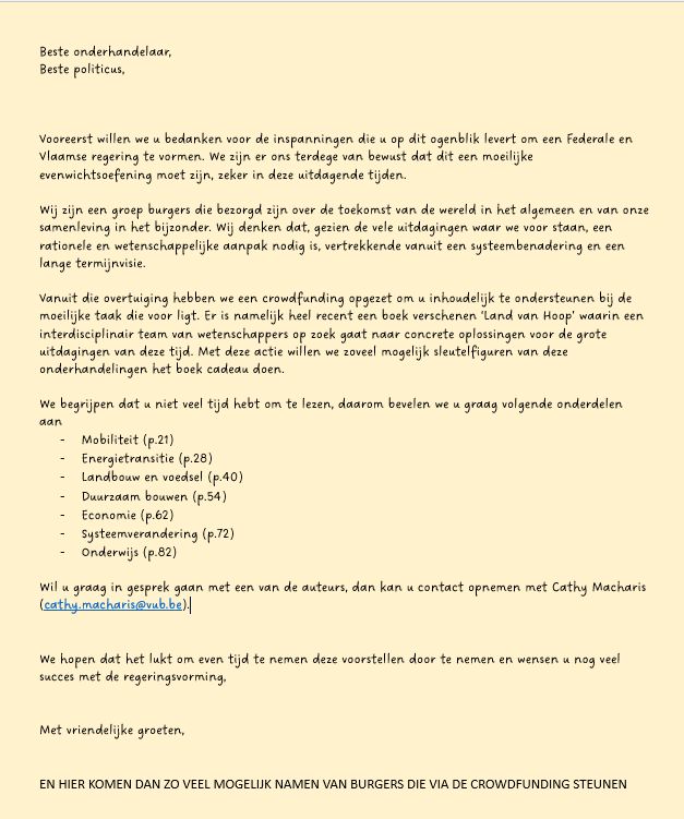 Op vrijdag 9 augustus fietsen langs de vijf kantoren van de partijen die nu aan het onderhandelen zijn. NV-A, Vooruit, CD&V, MR en Les Engagés. We vertrekken om 10u30 aan het centraal Station in Brussel en hopen rond 14u30 de fietstocht af te ronden. We willen het boek overhandigen aan de partij hoofdkwartieren, samen met een brief. En onder die brief willen we namen van burgers die de oproep willen ondersteunen. Je naam kan erbij komen als je een donatie doet via deze link (1 euro is voldoende). Als het niet lukt te doneren, geef gewoon je naam door, dan voeg ik die toe.