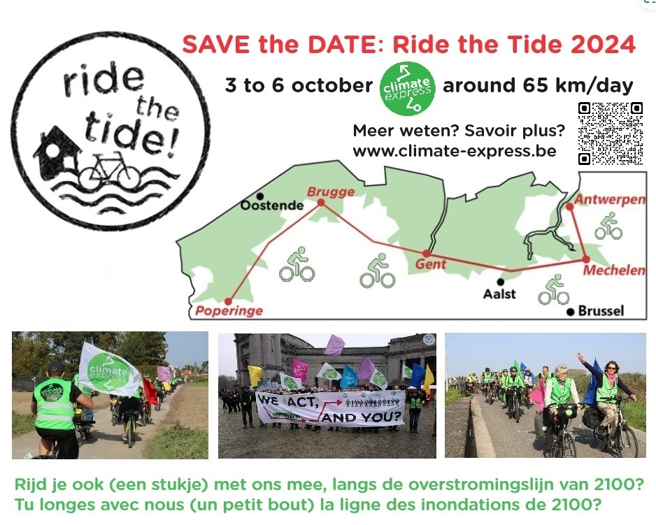Van 3 tot 6 oktober 2024 organiseren we de 4de editie van ‘Ride the Tide’, een vierdaagse fietstocht tussen Poperinge, Brugge, Gent, Mechelen en Antwerpen, langs de toekomstige vloedlijn zoals die er in 2100 zou kunnen uitzien als het (slechte) klimaatbeleid van België niet drastisch verandert. Onderweg ondernemen we actie, ontmoeten we activisten en leren we bij over klimaatgerelateerde onderwerpen.