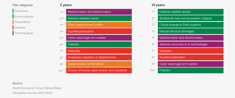Het hele circus van rijkelui in Davos laat me eerlijk gezegd koud, maar het jaarlijkse Global Risk Report blijf ik boeiende literatuur vinden. Het is al jarenlang een inspiratie voor het ‘rad der onfortuin’ dat ik regelmatig gebruik in lezingen. Ook in mijn boek ‘Hoop, een kompas in Turbulente tijden‘ van 2022 verwijs ik ernaar. Het rapport wordt gemaakt door 900 experts en aangevuld met een bevraging van 11 000 toplui uit de economie. De centrale vraag is niet meteen wat zijn de bedreigingen voor de wereld of de mensheid, maar wat zijn de risico’s voor de wereldwijde economie. Precies omdat de Davos-gangers de economische touwtjes in handen hebben, hechten ze veel belang aan goede risico-analyses.