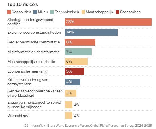 Opvallend, waar de voorbije jaren de grootste risico’s te linken waren aan klimaat en milieu is er nu een nieuwe nummer één: staatgebonden gewapend conflict. In andere woorden: oorlog.