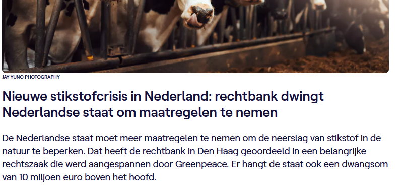 Fantastisch nieuws uit Nederland, waar de rechtbank de overheid dwingt om de stikstofcrisis echt aan te pakken. Het ziet er naar uit dat men er deze keer niet makkelijk onderuit zal geraken. Laat dit arrest ook een les zijn voor de Vlaamse regering, die zich evengoed in allerlei bochten wringt om de Europese regels aan de laars te lappen. Maar alerte burgers en milieuorganisaties staan ook hier klaar om naar de rechter te trekken.