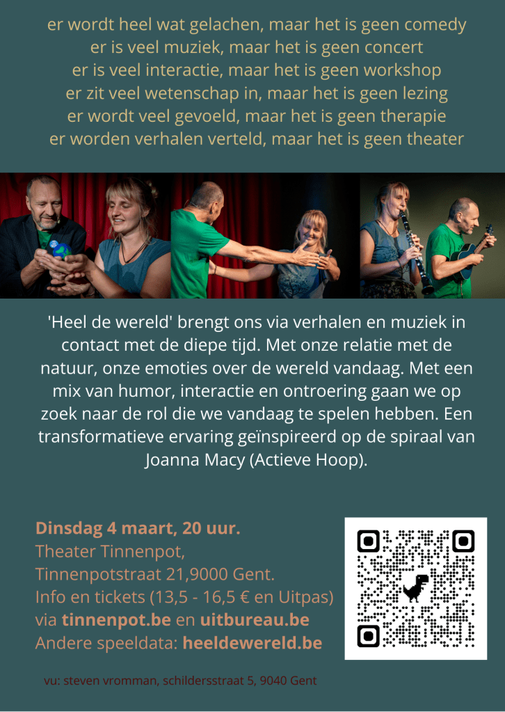 En nog een dingetje, misschien wil je ermee helpen. Omdat ik onze voorstellingen niet meer via Facebook kan aankondigen doe ik het nog even hier. Heel de Wereld: op 19 februari in Geraardsbergen (Uitverkocht), op 4 maart in theater Tinnenpot in Gent (hier tickets) en op 9 maart in Antwerpen (bijna volzet). Men zegge het voort.