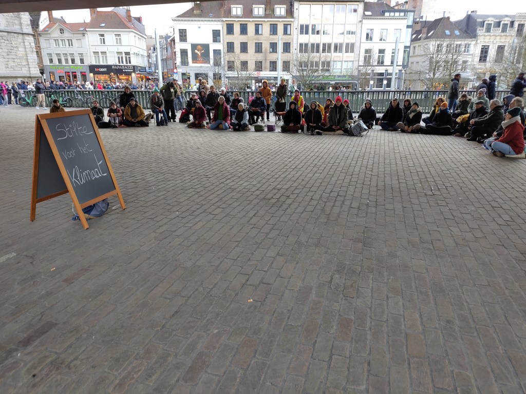 Wat Facebook en Instagram betreft lukt het prima. Misschien heb ik al van alles gemist, maar aangezien ik niet weet wat maak ik me daar geen zorgen over. Wat ik niet gemist heb is de eerste editie van samenstil. Een maandelijkse samenkomst van mensen die stil zitten voor de planeet. Er waren een veertigtal mensen verzameld onder de stadhal. Terwijl de drukte rondom gewoon verder ging, was het toch een sterk statement om deze groep sereen in stilte te zien zitten. Nogal wat toeristen vonden het in elk geval boeiend genoeg voor een paar foto’s. Op de kleine flyer stond te lezen.