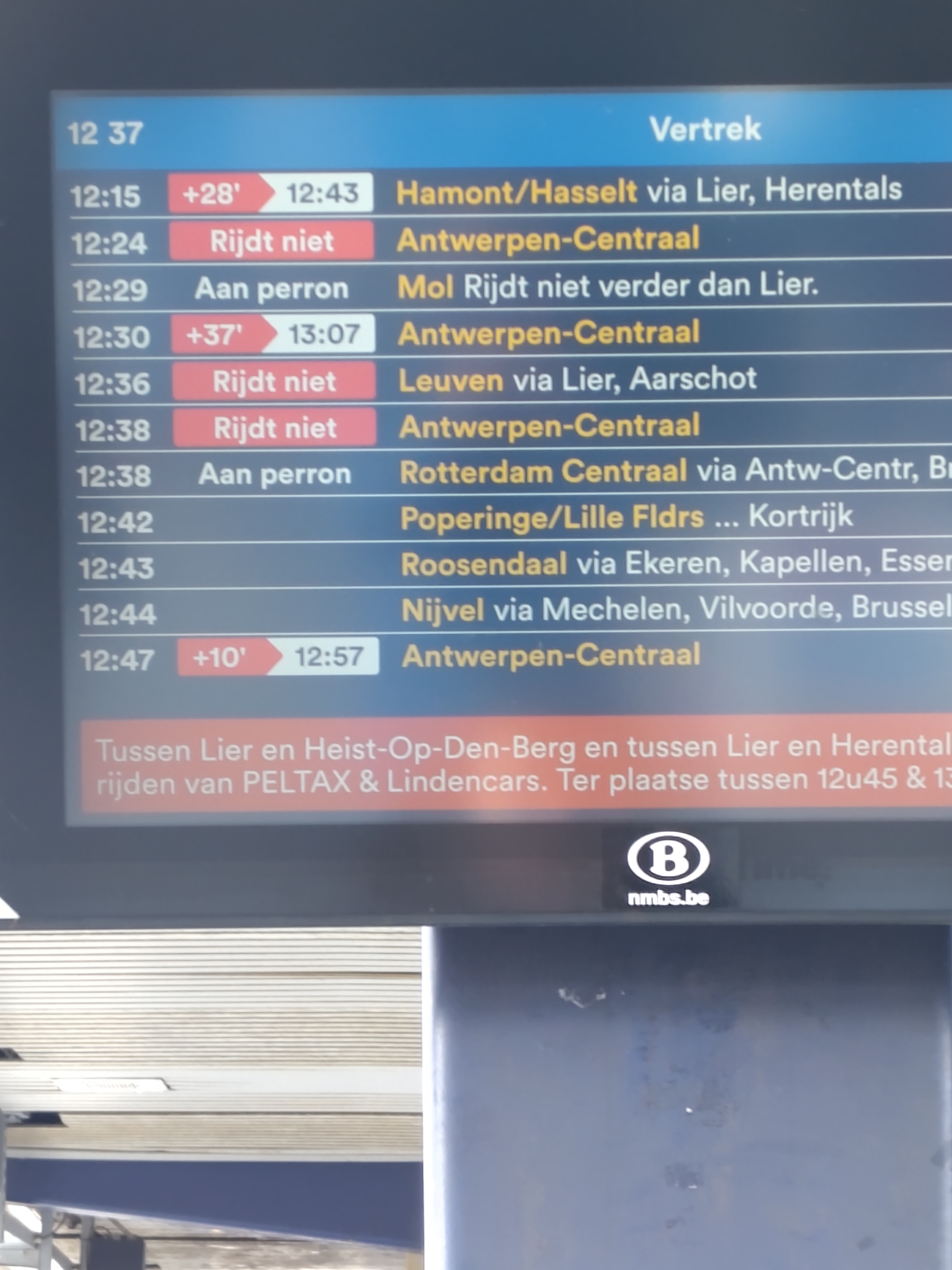 Bij aankomst in Berchem, waar ik moet overstappen naar Herentals, blijkt er een probleem. De trein die ik moet nemen heeft eerst 4, dan 6, dan 12, dan 14, dan 22 enzovoort minuten vertraging. Tegelijk wordt omgeroepen dat door een probleem in Lier er daar geen treinen meer langs kunnen. Het duurt niet lang of het aankondigingsbord ziet helemaal oranje uit. Een probleem met de bovenleiding, geen treinen mogelijk. Ondertussen zoek ik of er alternatieven routes zijn, of bussen, ik bel met de organisatoren die bekijken of ze me eventueel ergens kunnen oppikken, maar de klok tikt verder en het wordt duidelijk dat ik er niet meer op tijd zal raken. We beslissen de voorstelling te annuleren. Pech voor die mensen, pech voor mij, want ik doe dit graag en ik loop wat inkomen mis.